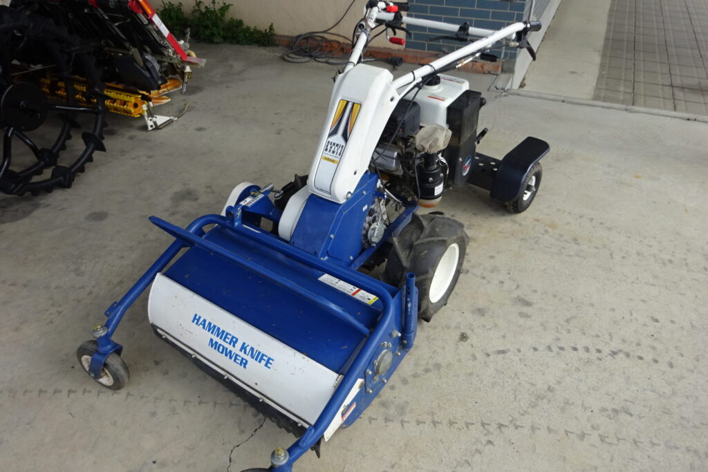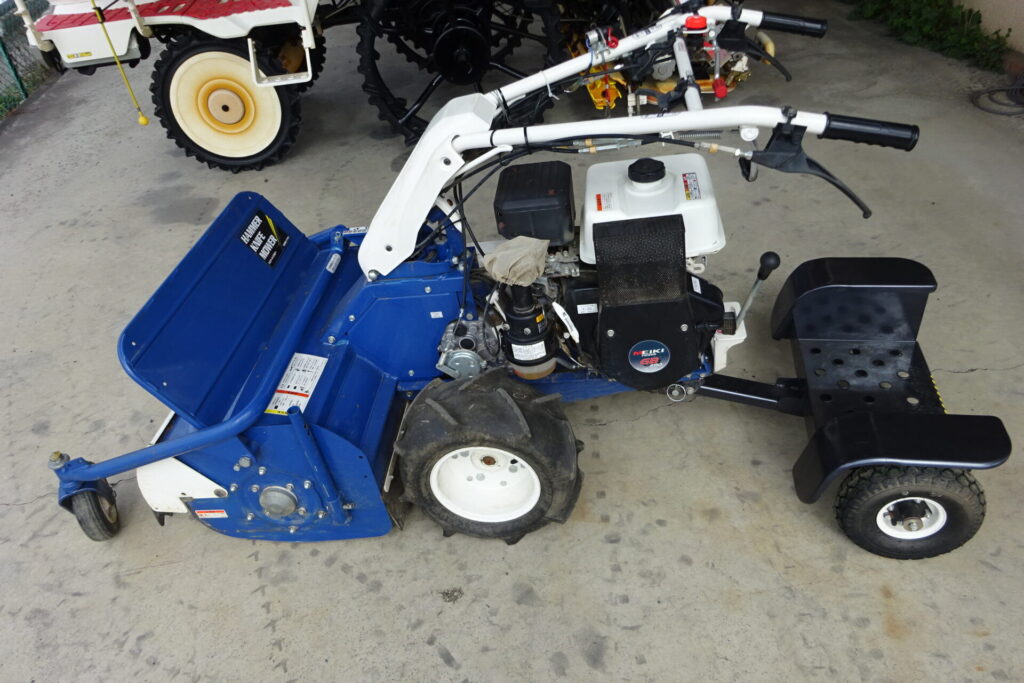 - イセキのハンマーナイフモアになります。現行型になります。リコイルスターターでエンジン始動になります。立乗りステップが付いてます。現状販売